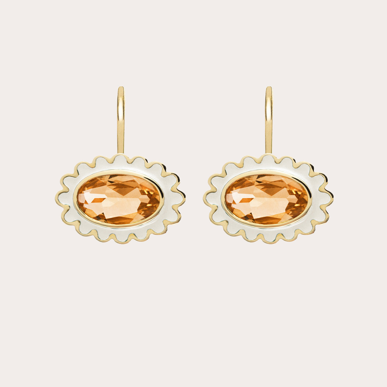 The Margarita earrings combine whimsy and refinement, featuring radiant gold, green amethyst, and delicate light yellow enamel, making them light-catching, joy-sparking, and elegantly elegant.