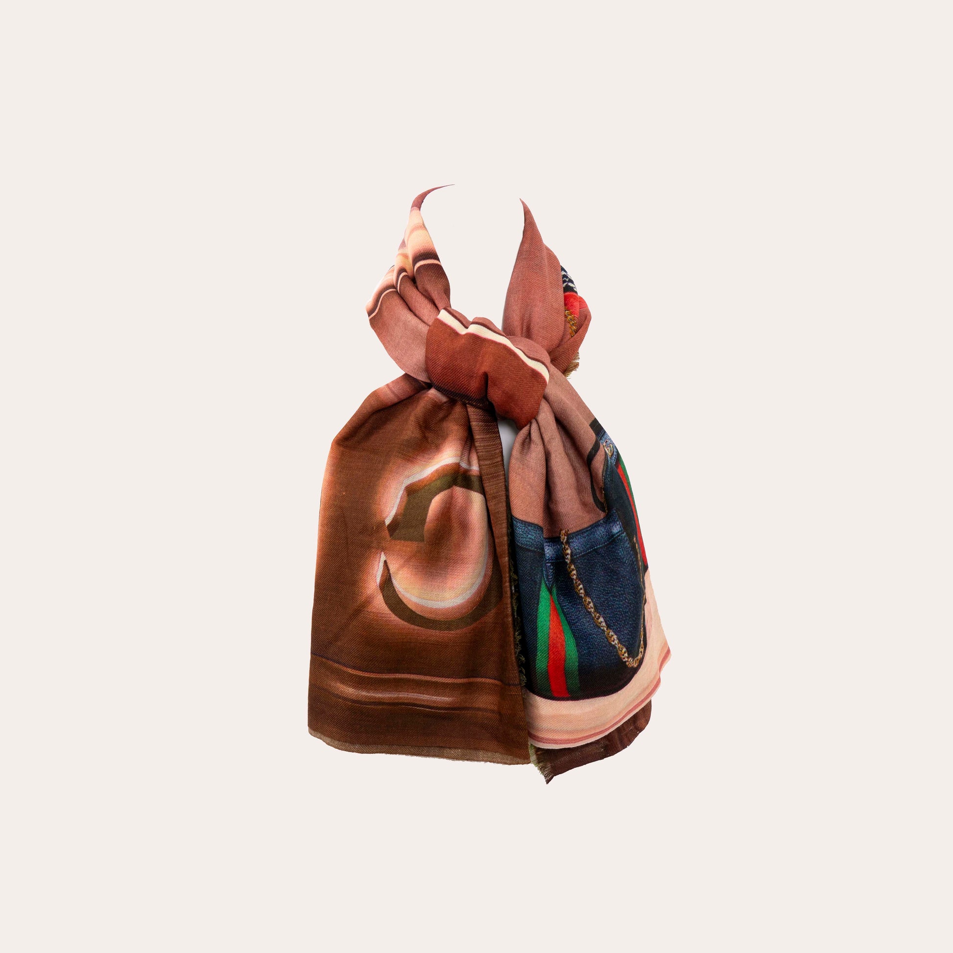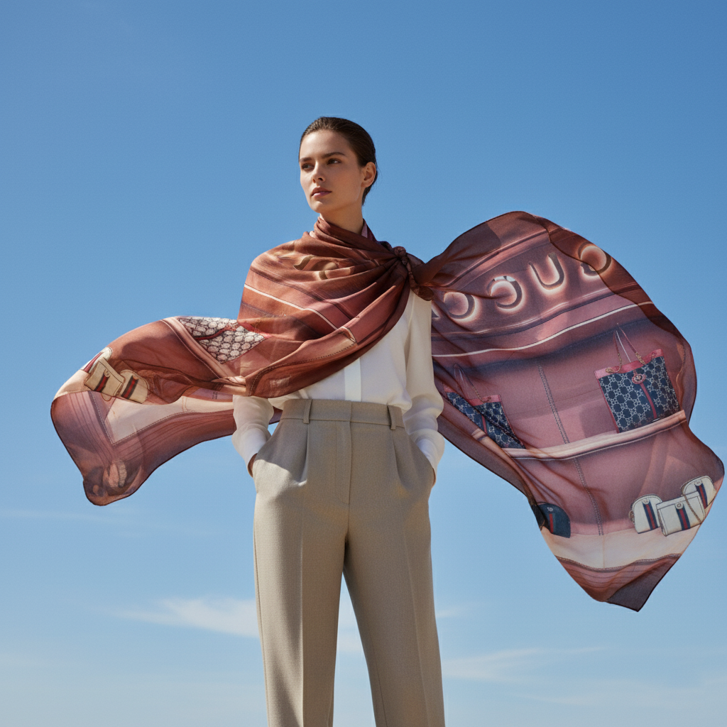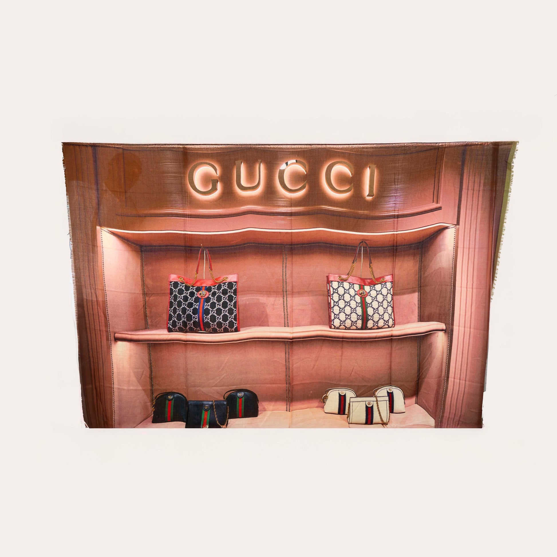A luxury statement scarf featuring a bold Gucci boutique print. The design showcases a storefront display with illuminated ‘GUCCI’ signage and shelves adorned with signature Gucci handbags in iconic monogram patterns.