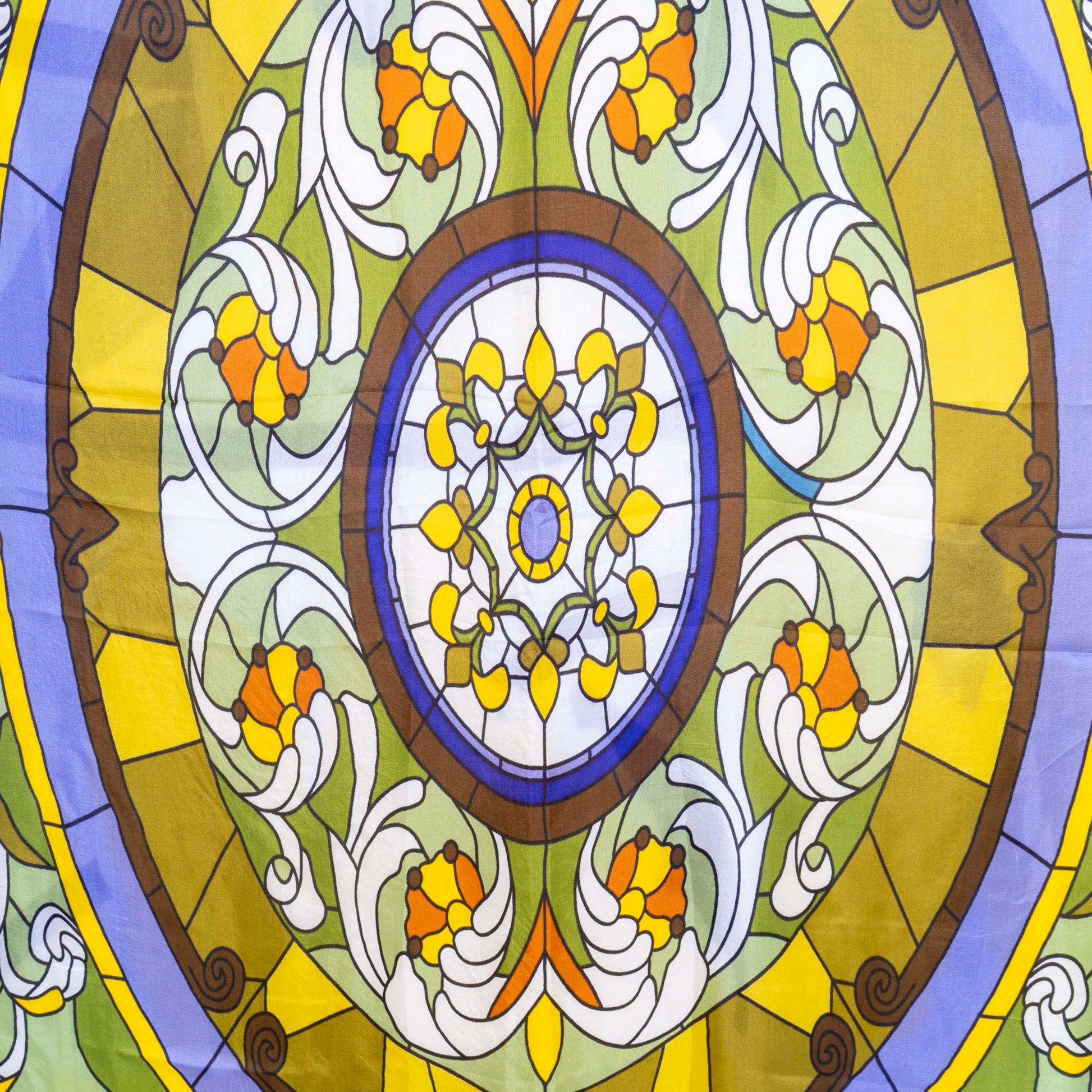Rectangular scarf featuring a stained-glass inspired pattern in yellow, green, purple, and white with ornate circular and floral designs.